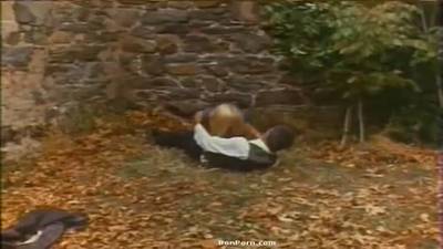 - En marge d'un bal de campagne, un homme à barde suit une belle femme blonde à l'extérieur. C'est une nymphomane qui se caresse sans cesse la chatte et l'excitation monte petit à petit chez le viel homme. La nympho lui ordonne alors de retirer sa veste et de venir lui faire un cunilingus. On voit alors que c'est une chatte poilue de blonde naturelle et le barbu se régale... Les coquins s'allongent ensuite sur le sol plein de feuilles mortes et après une rapide fellation, elle chevauche le vieux barbu jusqu'à ce qu'il jouisse sur ses poils de foune.