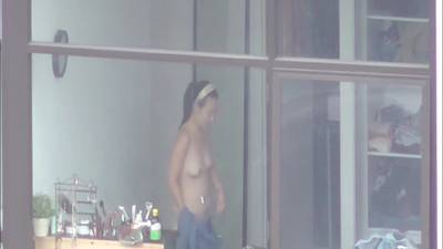 - Les grands baies vitrées de cette chambre d'hôtel ne cachent pas l'intérieur de son appartement, du coup cette femme est épiée par un voisin voyeur situé juste en face. Sans prendre la précaution de tirer les rideaux ou de baisser les stores, elle retire sa nuisette pour enfiler sa lingerie et ses fringues. C'est décidément excitant de la voir chez elle en train de vaquer à ses occupations et de montrer son cul. Ce mateur semble d'ailleurs l'épier de jour comme de nuit tant elle est belle !