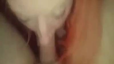 - Cette jeune garce aux cheveux oranges et vêtue d'une robe moulante en latex est bandante avec son décolleté vertigineux ! Transformée en aspirateur à bite, la voilà qui fait apprécier la gorge profonde à son complice allongé sur le dos. Ses couilles ne sont pas oubliées par cette lécheuse et bientôt son gland se retrouve entre la naissance de cette jolie paire de seins naturels. Puis rebelote pour la pipe jusqu'à ce que ce lascar ne puisse plus se retenir. En guise de conclusion bienheureuse, il se vidange directement entre les lèvres de cette avaleuse.