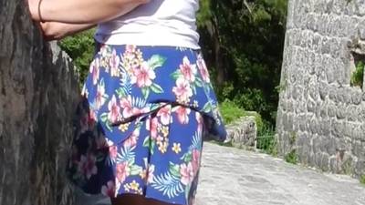 - À l'ombre de la montagne Sainte-Victoire dans les Bouches-du-Rhône, il y a souvent beaucoup de vent comme aujourd'hui. Alors que la tramontane souffle à son maximum, cette petite coquine en profite pour se balader en minijupe alors même qu'elle a oubliée de mettre une culotte en dessous. C'est effectivement fait exprès, car cela lui permet de s'exhiber tranquillement. Le vent ne manque pas de soulever sa jupe en permanence, ce qui nous permet de voir ses belles fesses et son petit minou par devant. C'est son copain qui filme qui est bien heureux de la situation.