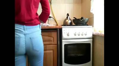 - Nous voici dans la cuisine d'une jeune femme russe qui a sans aucun doute un très beau Cul. Ainsi, alors que le mec filme dans une robe moulante, elle enfile ensuite un pantalon qui moule à la perfection son popotin. Ça méritait bien une levrette en direct devant la fenêtre.