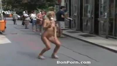 - La belle blonde qui vient des pays de l'Est se trouve dans la rue lorsqu'elle commence à retirer sa robe moulante. La belle étrangère se retrouve totalement nue en public et tous les gens autour d'elle l'observent pendant son exhibition. Un goupe de déménageur n'en revient pas tellement la femme est canon. En voilà une belle étudiante qui a compris comment arrondir ses fins de mois.