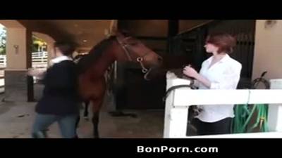 - C'est une jeune femme qui fait du cheval devant une petite coquine qui elle a comme boulot de s'occuper du canasson tout le reste de la journée. Mais aujourd'hui l'humeur est plutôt détendue entre les deux minettes, et lorsqu'elle descend de son animal, elle se rapproche tout de suite de la jolie brunette. Après un petit baiser, les deux nanas s'en vont dans le harras au calme et la meuf est super excitée de voir pour la première fois les beaux et gros seins de l'autre fille. Alors, directement, elle se met à les lécher, peloter, puis elle doigte sa vulve et lui fait même un bon cunnilingus pour la faire jouir et la remercier de bien s'occuper de son étalon.