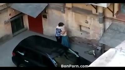 - C'est une véritable pièce de théâtre qui se déroule dans la cour intérieure d'un immeuble en Russie. Un jeune couple est à la fois en train de s'aimer et de se disputer sans se douter qu'ils ont filmé par des gars au 4e étage. La nana est vraiment grosse, mais c'est peut-être cela qui excite le type en plus d'etre dehors et de pouvoir se faire surprendre. Une chose est certaine, après avoir insisté plusieurs minutes, il se jette sur elle et la baise en levrette puis par devant même si elle tient absolument à garder sa robe pour cacher sa chatte.