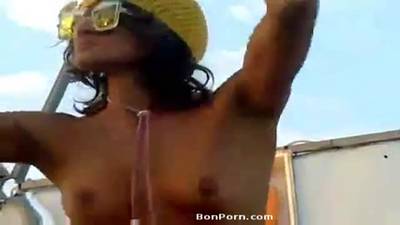 - Danseuse nue - La vidéo a été tournée à Kazantip où la fête bat son plein sur la plage. Et une des raveuses a surement un peu trop bu et elle se retrouve en train de danser totalement nue sur le bar. C'est en journée donc il n'y a pas trop foule mais quand même. D'ailleurs l'un de ses amis la filme pour lui montrer ses exploits d'exhibitionniste le lendemain quand elle aura la gueule de bois. En tout cas, elle est sexy avec ses petits seins nue, cette danseuse improvisée.