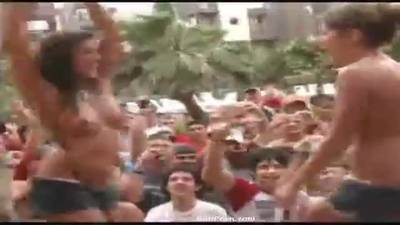 - En direct du Texas. La sauce pour réussir un bon Spring Break, c'est le concours de T-shirts mouillés avec de vraies salopes qui aiment l'exhib. Et il ne faut pas oublier la foule de mecs en délire. Les chaudasses commencent à déambuler sur le podium et l'un des organisations du Spring Break renverse de l'eau sur leurs vêtements pour rendre transparent leur T-shirt. On peut alors matter leurs nichons et les tétons qui pointent d'excitation ! Rapidement, elles sont tellement mouillées qu'elles finissent par retirer totalement leurs fringues pour être plus à l'aise.... et recevoir un max de votes pour gagner ce concours !